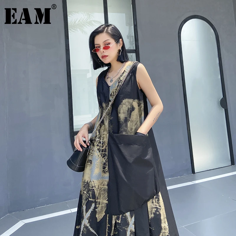 Женское платье с принтом EAM, черное ассиметричное плиссированное платье без рукавов с треугольным вырезом, весенне-летняя мода 2020 1U087