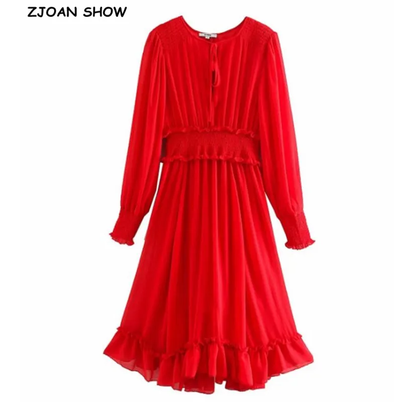 2020 весеннее женское платье с галстуком-бабочкой и v-образным вырезом, красное платье с длинным рукавом, винтажное платье с деревянными ушками и эластичной резинкой на талии, длинные платья с оборками, женские платья