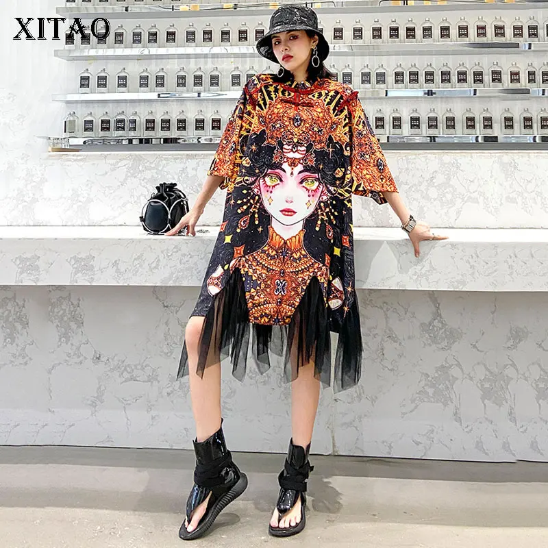 XITAO/женское платье в китайском стиле с коротким рукавом и индивидуальным принтом; Модная Свободная Женская одежда с сеткой; Большие размеры; Новинка; XJ4434