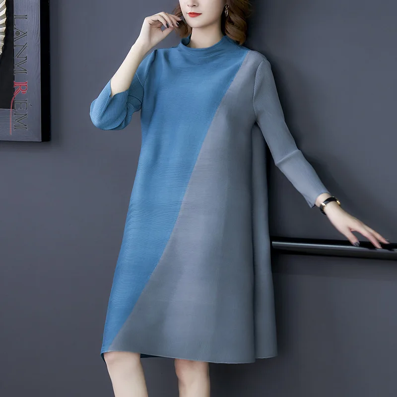 LANMREM 2020 Новое весеннее платье средней длины со стоячим воротником популярного цвета женское винтажное свободное повседневное ТРАПЕЦИЕВИДНОЕ плиссированное платье PD753