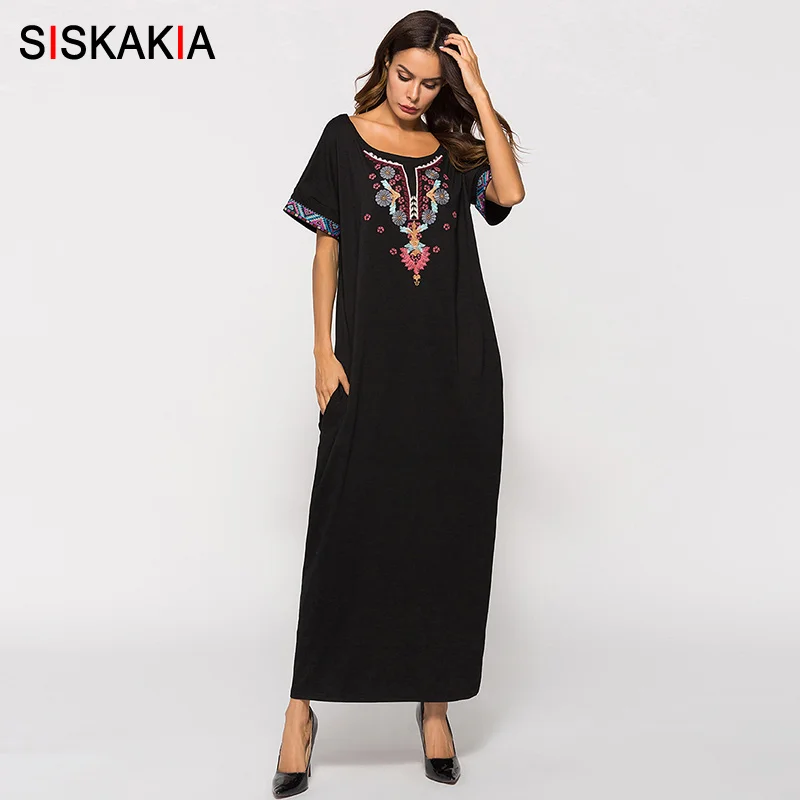 Siskakia женское длинное платье черное этническое платье с вышивкой в стиле пэчворк Макси Летние 2018 городские повседневные футболки платье мус...