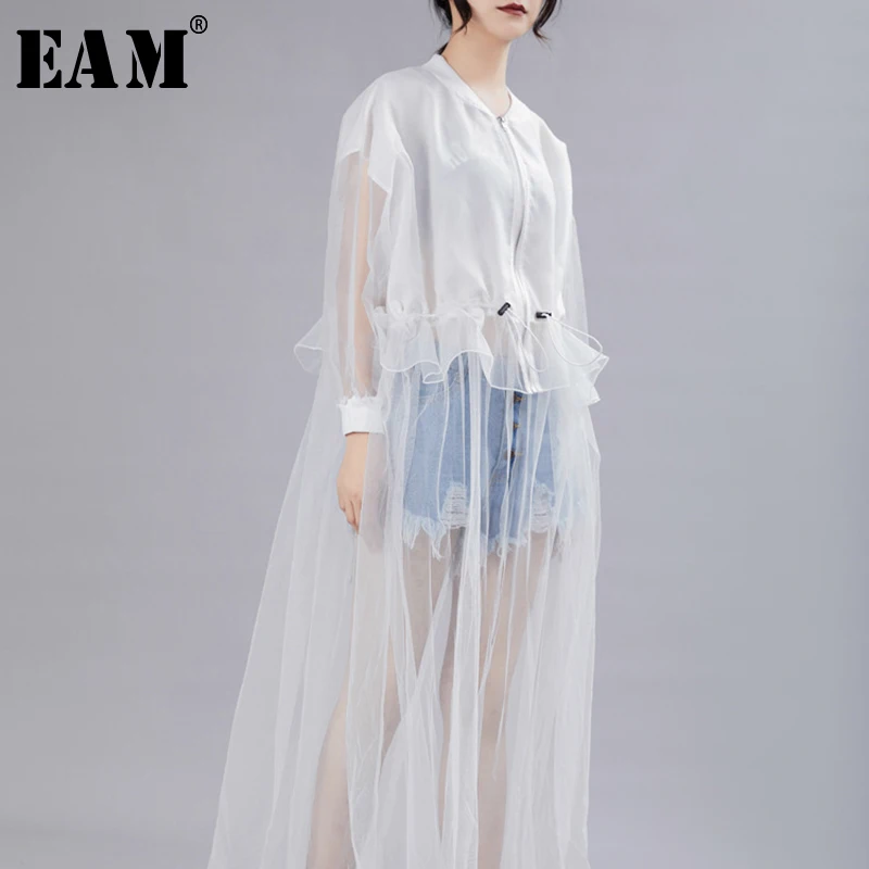 [EAM] Новое Женское платье с длинным рукавом и стоячим воротником «летучая мышь», свободное платье из сетчатой ткани, плиссированное, модное, ...