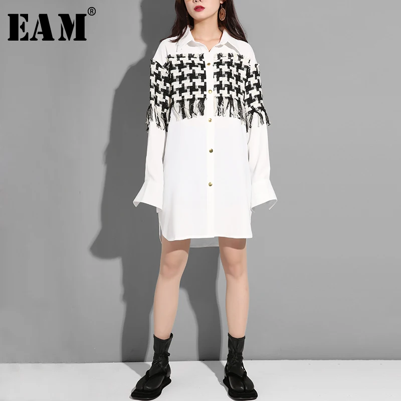[EAM] Новинка 2019 года весна лоскутное кисточкой Turn-Down воротник длинный рукав плед Винтаж рубашка платье для женщин мода прилив YE6460