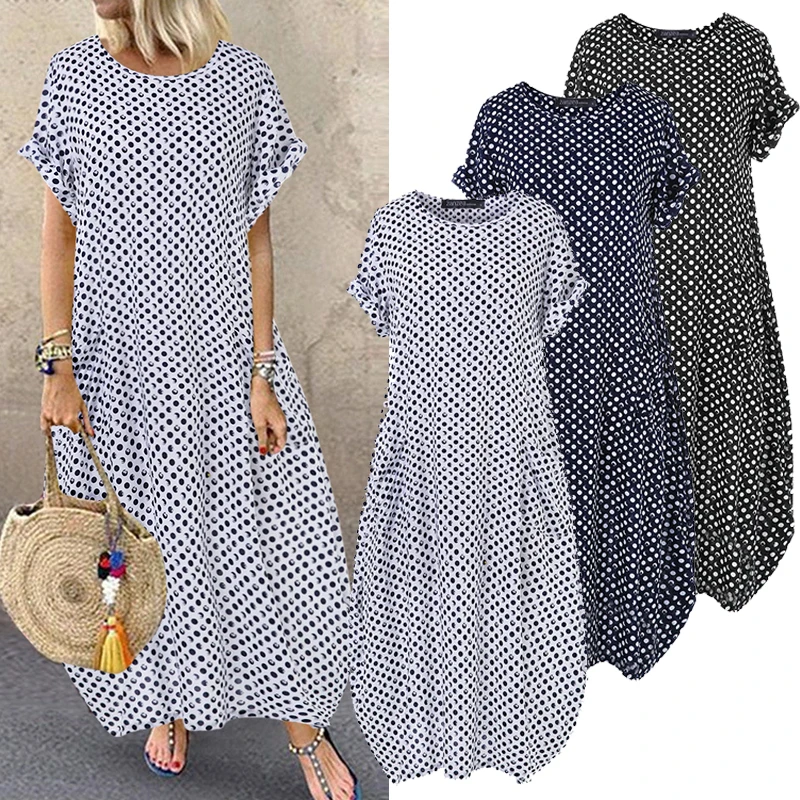 Модное летнее платье с принтом женский сарафан ZANZEA 2020 туника с коротким рукавом макси Vestidos Женский Повседневный халат в горошек оверсайз