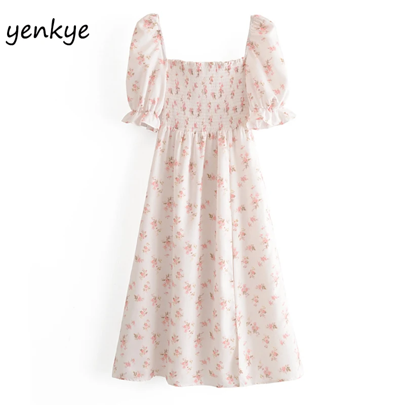 Милое шифоновое платье с цветочным принтом, женское платье с квадратным вырезом и пышными рукавами, сексуальное платье миди трапециевидной формы, летнее элегантное женское платье