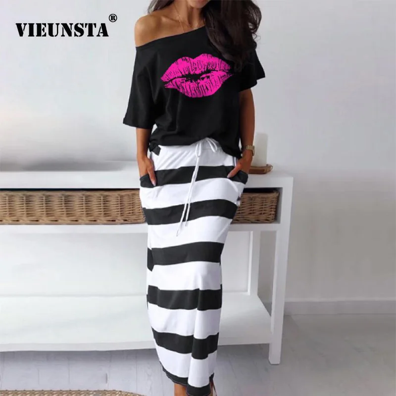 Vieuunsta S-5XL, Женский Топ с открытыми плечами и юбка, комплект из двух предметов, платье, осенняя блузка с рукавами летучая мышь, рубашка, Полосатое платье с карманами и принтом
