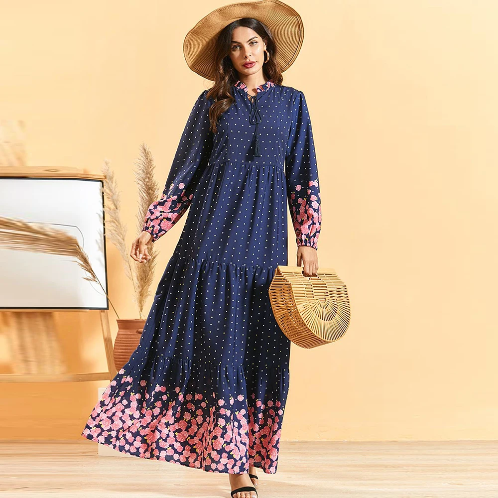 Платье с длинным рукавом Siskakia, длинное платье темно-синего цвета в стиле бохо с цветочным принтом и стоячим воротником, в этническом и мусульманском стиле