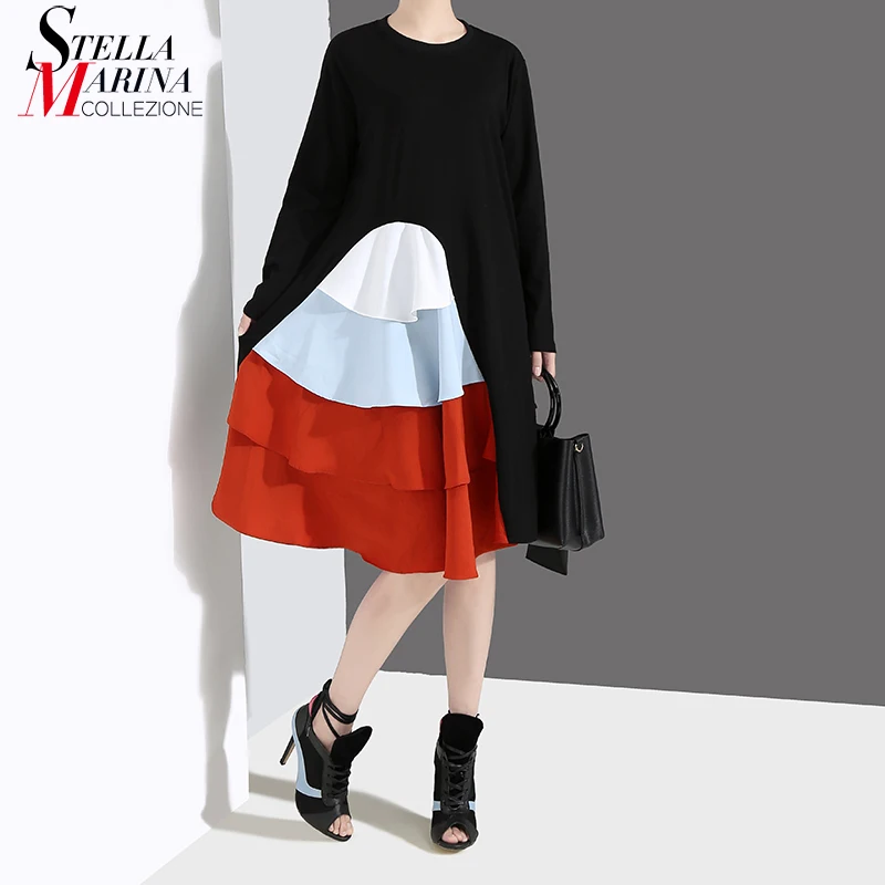 Новинка 2019 г. корейский стиль Для женщин с длинным рукавом весеннее платье черный каскадные оборки женский Повседневное лоскутное вечерние...