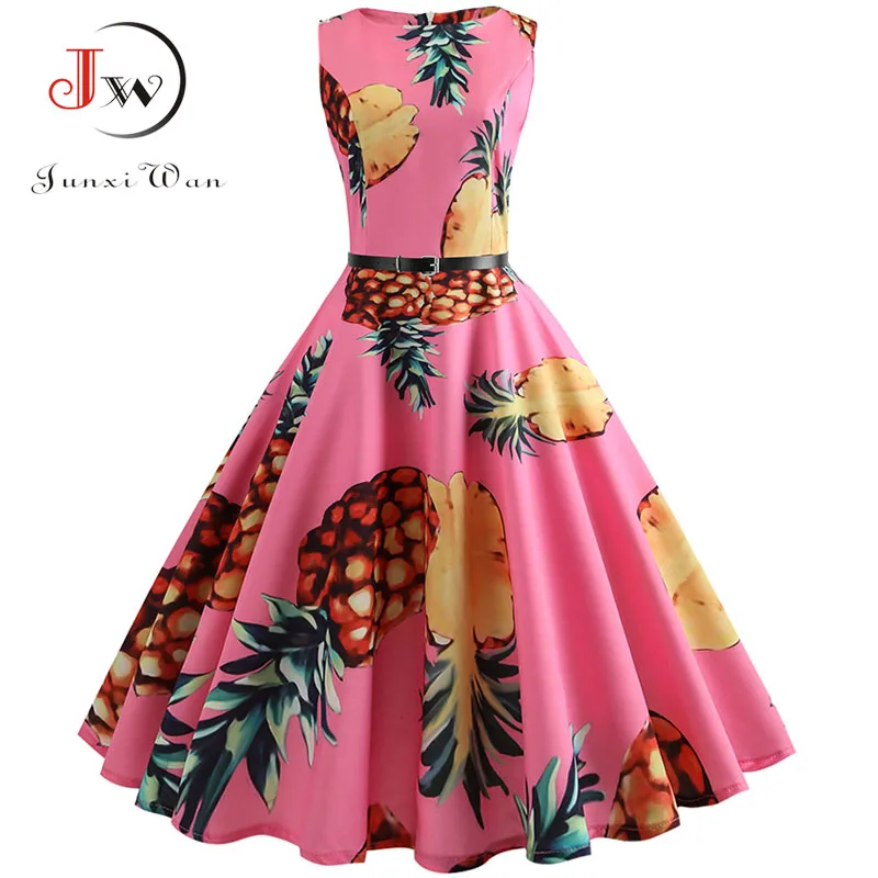 С принтом ананаса Винтаж платье Для женщин летние Pin Up Ретро 50 s рокабилли рукавов A-Line Midi Платья для вечеринок пояс плюс Размеры