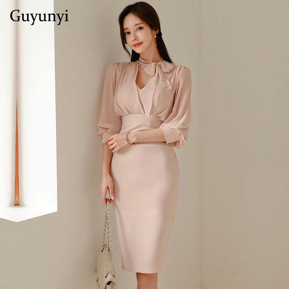 Розовое офисное женское платье, осень 2019, простое шифоновое платье с высокой талией и пятиточечным рукавом, темпераментное элегантное вече...