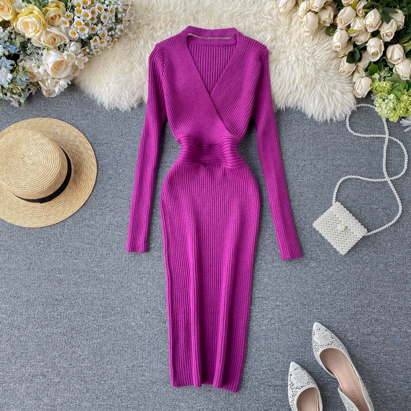 Тонкое 2020 трикотажное платье с бретелькой через шею, сексуальное ажурное трикотажное платье-свитер, обтягивающее платье-миди вечерние с дл...