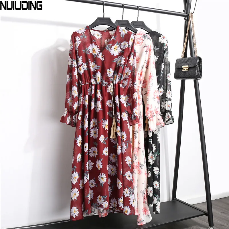 NIJIUDING женские шифоновые платья с цветочным принтом 2020 Новое весеннее платье с v-образным вырезом и длинным рукавом платье на шнуровке с высо...
