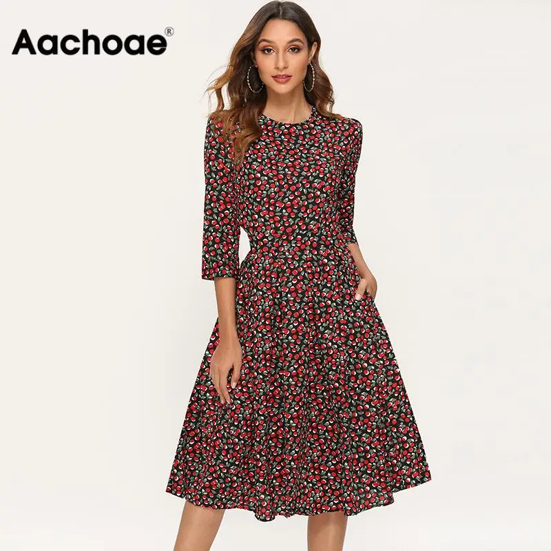 Элегантные женские платья 2019, винтажные Вечерние Платья с цветочным принтом, осенние платья с рукавом три четверти и круглым вырезом