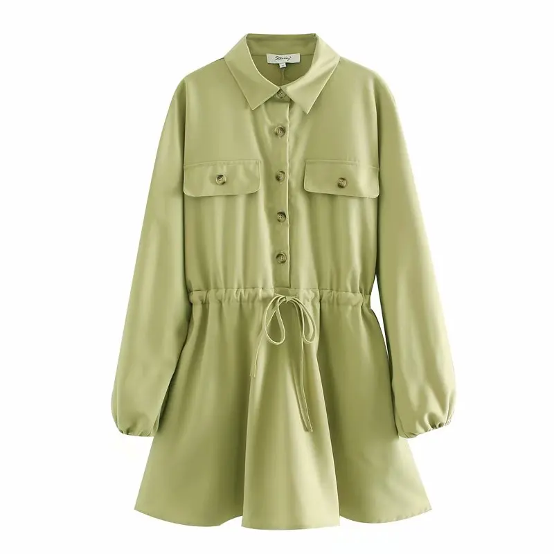 Новинка 2020, женское однотонное платье-рубашка с длинным рукавом и завязками, женское повседневное приталенное мини-платье с двойными карманами DS3495