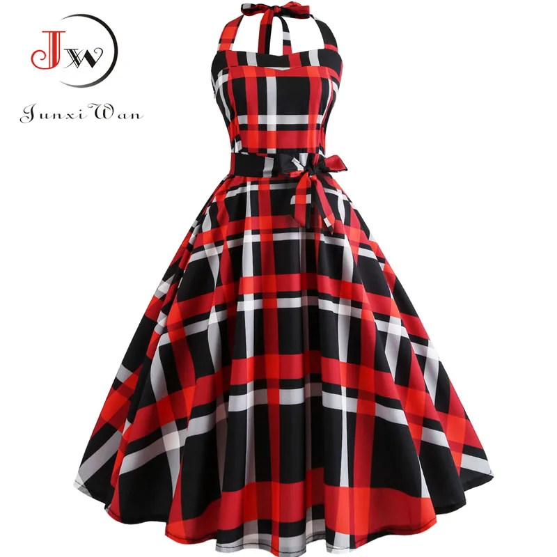 Плед печати Холтер без бретелек женское платье летние пикантные спинки платья для вечеринок элегантные женские Винтаж рокабилли Vestido