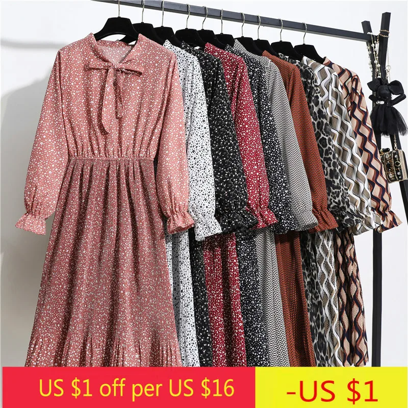 Платье с длинными рукавами и цветочным принтом весеннее Новое Элегантное шифоновое платье средней длины в Корейском стиле с бантом на воротнике праздничное Повседневное платье трапециевидной формы Vestidos