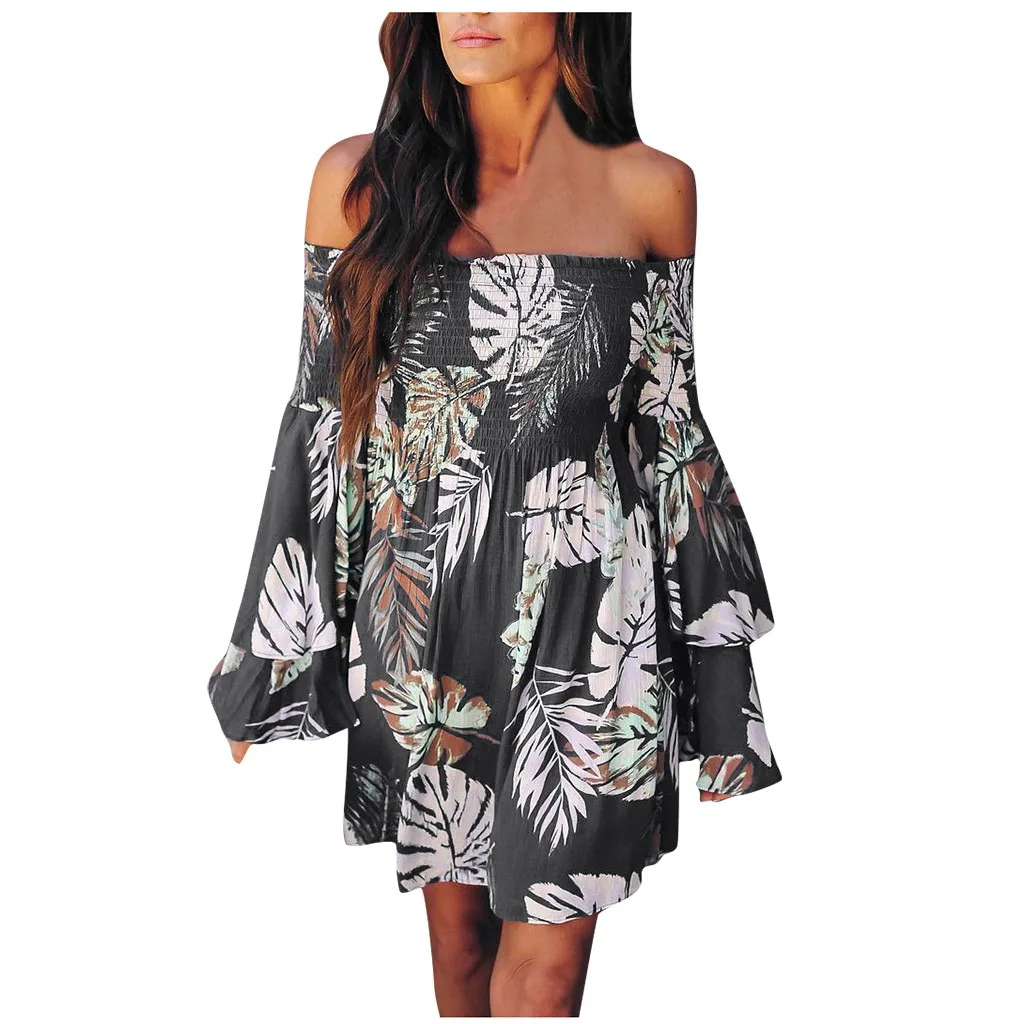 Сексуальное мини-платье с принтом vestidos женские вечерние праздничные Модные платья с открытыми плечами и рюшами с длинными рукавами мини-черное платье с принтом # C9