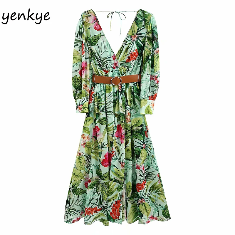 Женские летние платья с зеленым принтом Boho, длинное платье макси с v-образным вырезом и длинным рукавом, сексуальное шифоновое платье трапециевидной формы с открытой спиной и поясом