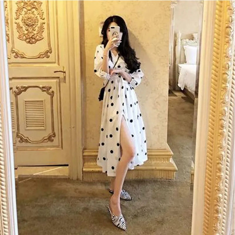 2019 Весна Плюс Размер M-4XL женские платья в горошек с v-образным вырезом женские платья черный богемный уличный халат брендовая одежда с рукав...