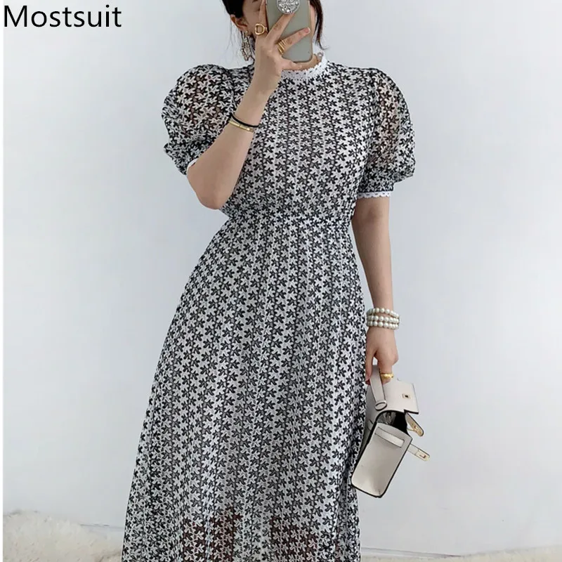 2020 летнее корейское кружевное открытое длинное платье для женщин с коротким рукавом и стоячим воротником женские элегантные модные платья Vestidos Femme