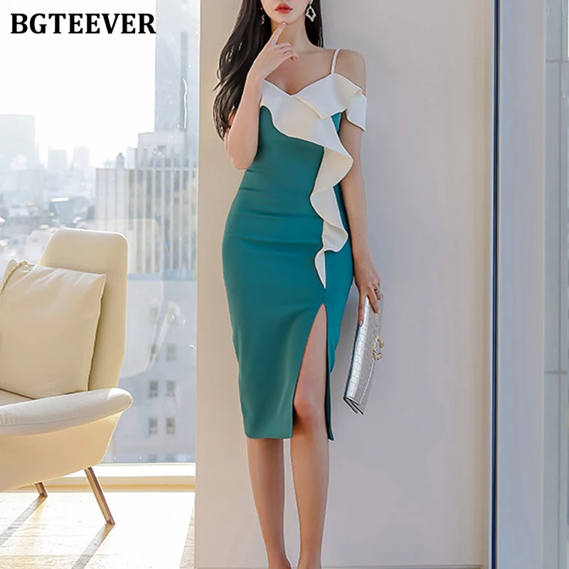 BGTEEVER элегантное лоскутное женское платье на бретельках, летнее платье с оборками и разрезом, модное вечернее платье, женское платье-футляр