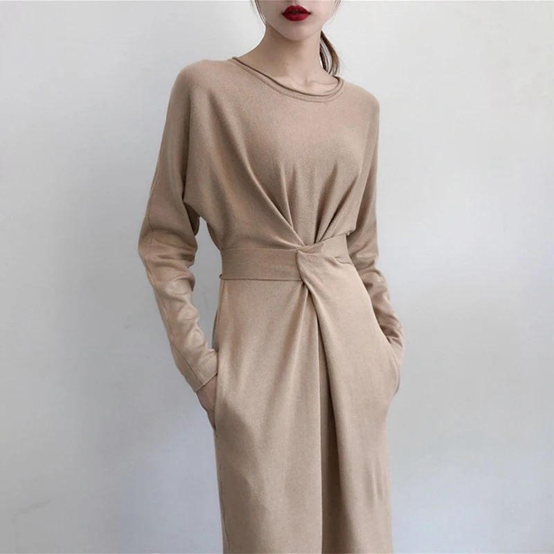 Женское трикотажное платье средней длины с круглым вырезом и длинным рукавом, женские платья с разрезом и скрученным узлом, весна-осень 2020, повседневные женские платья