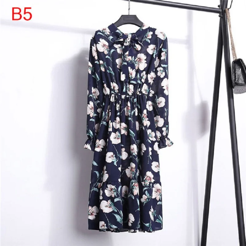 Винтажное весенне-летнее праздничное платье для женщин, Модное шифоновое миди-туника с цветочным узором в горошек, тонкое офисное платье с длинным рукавом и высокой эластичной талией