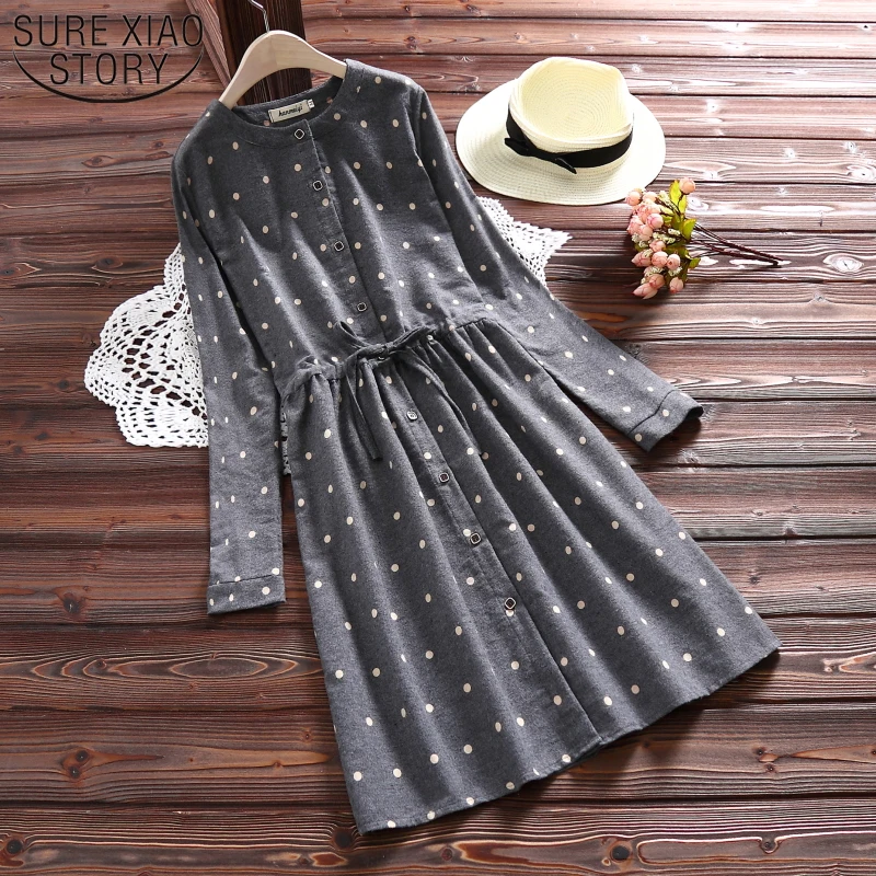 Серый темно синие повседневное свободные платья 2019 демисезонный в стиле Mori Girl женские платье с принтом в горошек длинный рукав женский Vestidos...