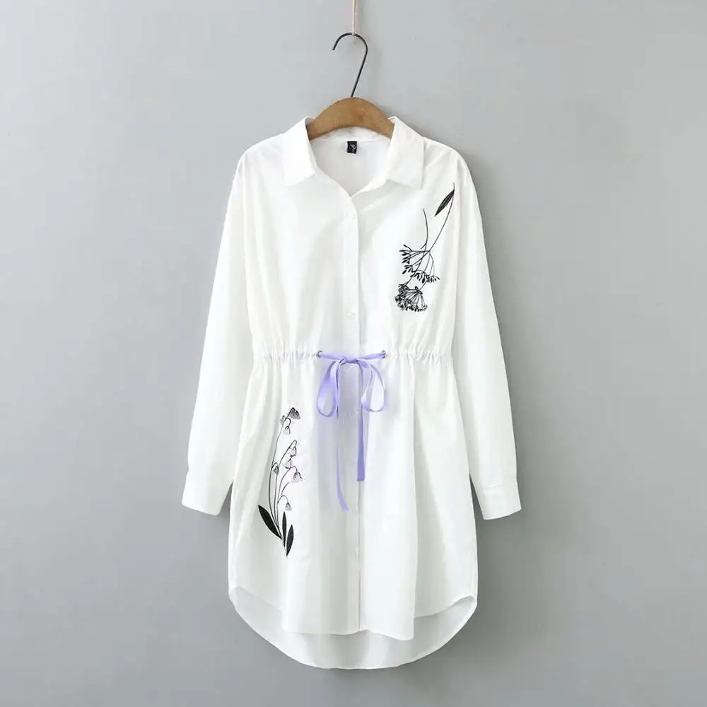 Узкая талия плюс размер вышивка женские длинные белые хлопковые рубашки платье 2020 Новые повседневные женские весенние Осенние блузки женские топы