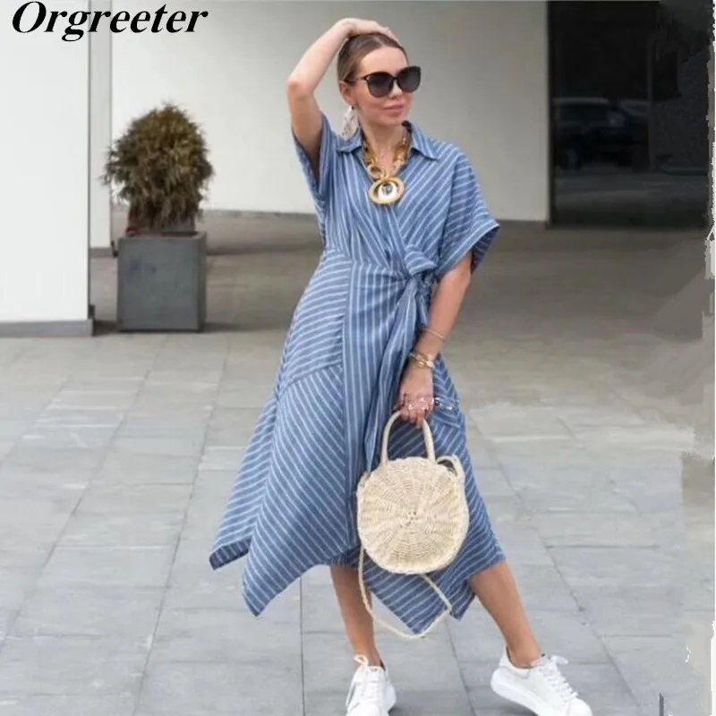 Повседневное модное женское платье, летнее короткое платье с рукавом «летучая мышь», Полосатое длинное платье с разрезом, сексуальное платье с v-образным вырезом, асимметричное платье-рубашка, Vestidos