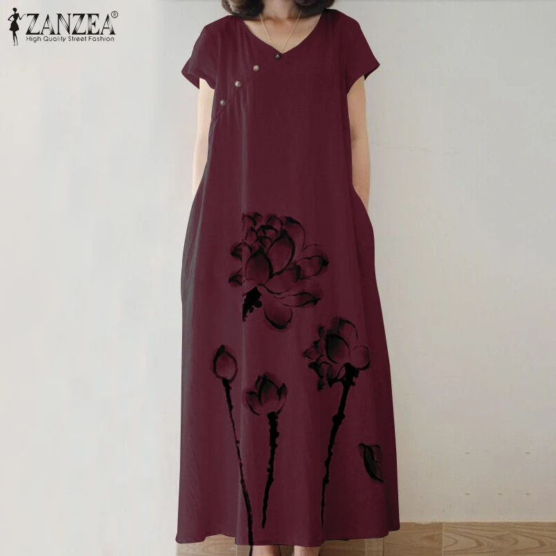 ZANZEA Лето Винтаж Цветочный Принт Сарафан для женщин V образным вырезом короткий рукав хлопок белье платье свободные Vestido Кафтан платья мешковатые