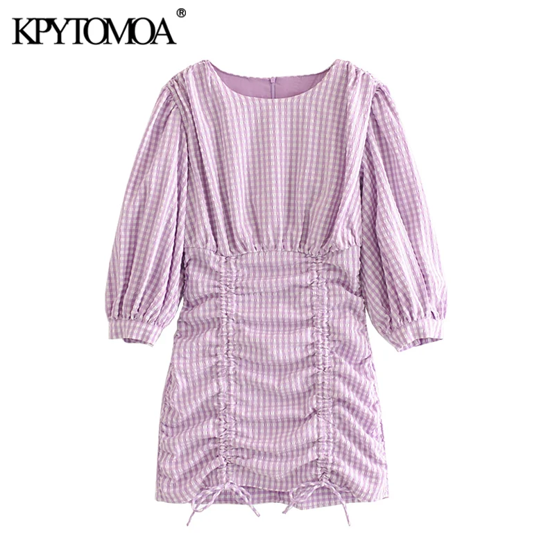 Женское плиссированное платье KPYTOMOA, винтажное мини-платье в клетку с круглым вырезом и рукавом три четверти на завязках, модель 2020