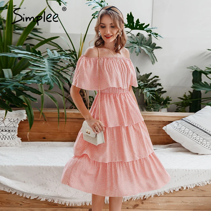 Simplee Сексуальное Женское летнее платье с открытыми плечами, элегантное платье в горошек с коротким рукавом, пляжный сарафан для отдыха дамы миди платье 2020