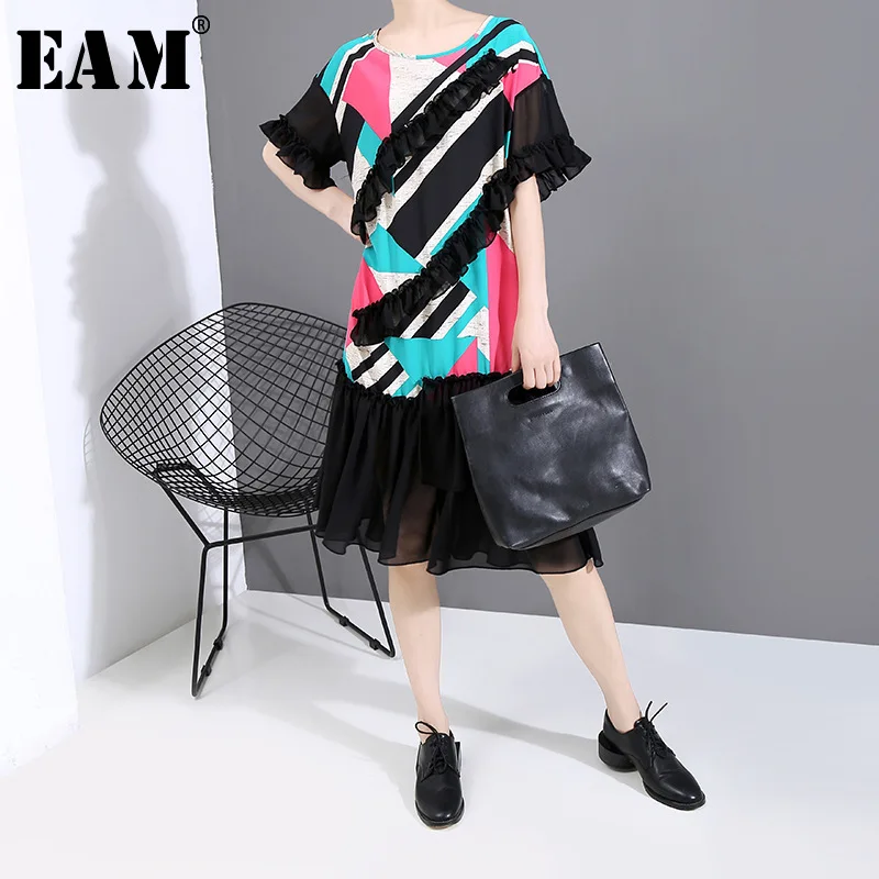Женское шифоновое платье EAM, черное платье с принтом и оборками, круглый ворот, короткий рукав, свободный крой, весна-лето 2020 1W177
