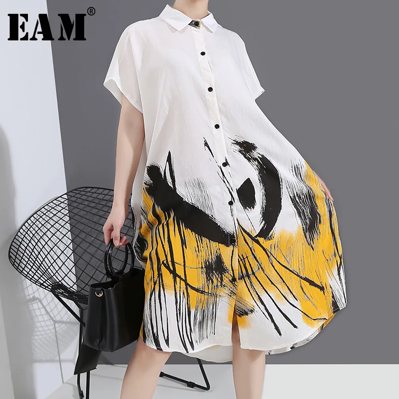 [EAM] женское белое платье-рубашка большого размера с разрезом и принтом, новинка, с отворотом, короткий рукав, свободный крой, Мода весна-лето 2020, 1T428
