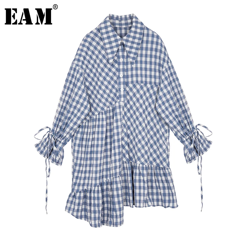 [EAM] женское синее клетчатое платье-рубашка большого размера, новинка, с отворотом, с длинным рукавом, свободный крой, модная одежда, весна-осень 2020, 1S350