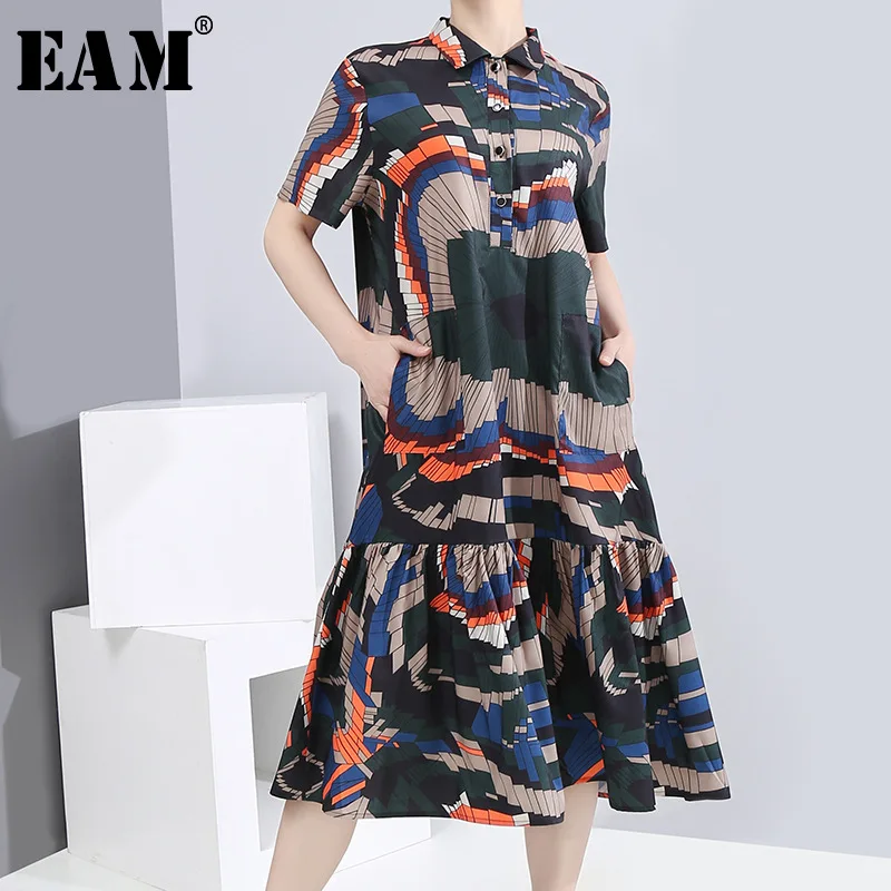 [EAM] женское плиссированное платье средней длины с рисунком и разрезом, новинка, с отворотом, короткий рукав, свободный крой, модный стиль, весна-лето 2020, 1S88