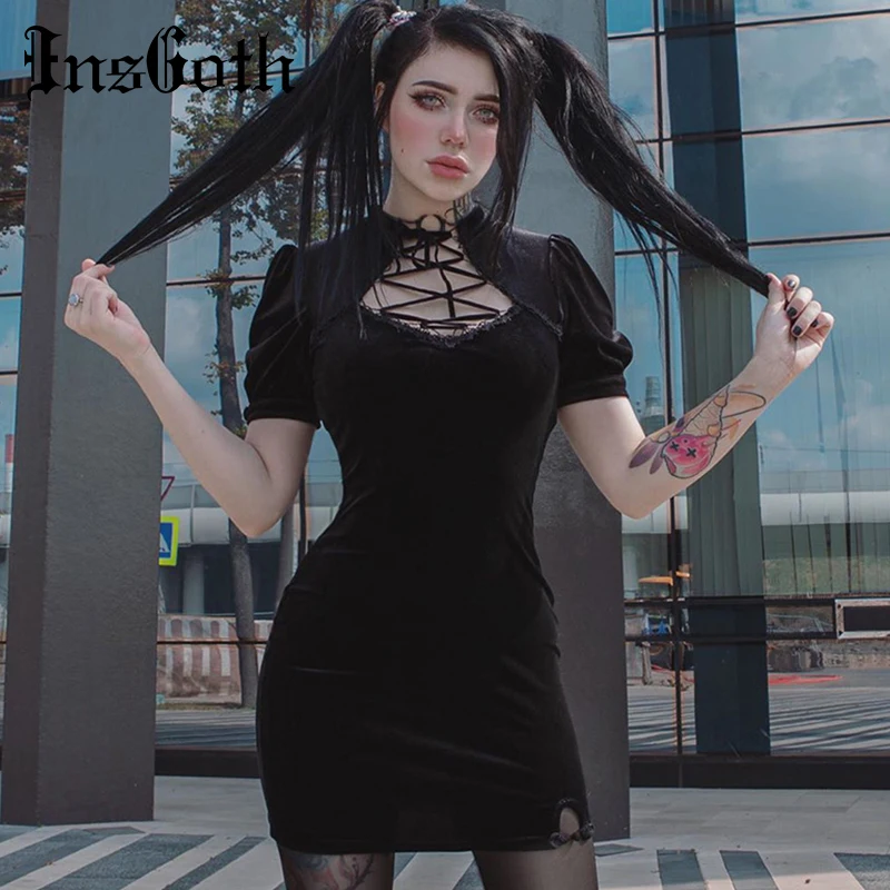 InsGoth ретро стиле бандаж с черной петлей-короткий рукав мини платье Для женщин готика уличная Женское платье элегантные Винтаж вечерние платья