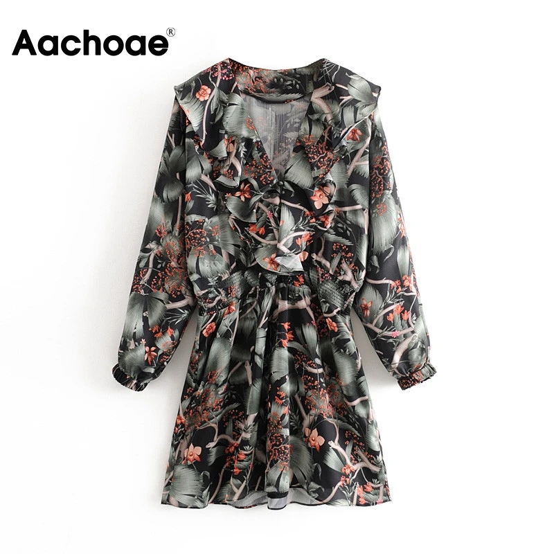Женское мини-платье в стиле бохо с цветочным принтом, рукав «летучая мышь», с длинным рукавом, женское ТРАПЕЦИЕВИДНОЕ ПЛАТЬЕ С v-образным вырезом и оборками, женское элегантное платье, Vestido Mujer