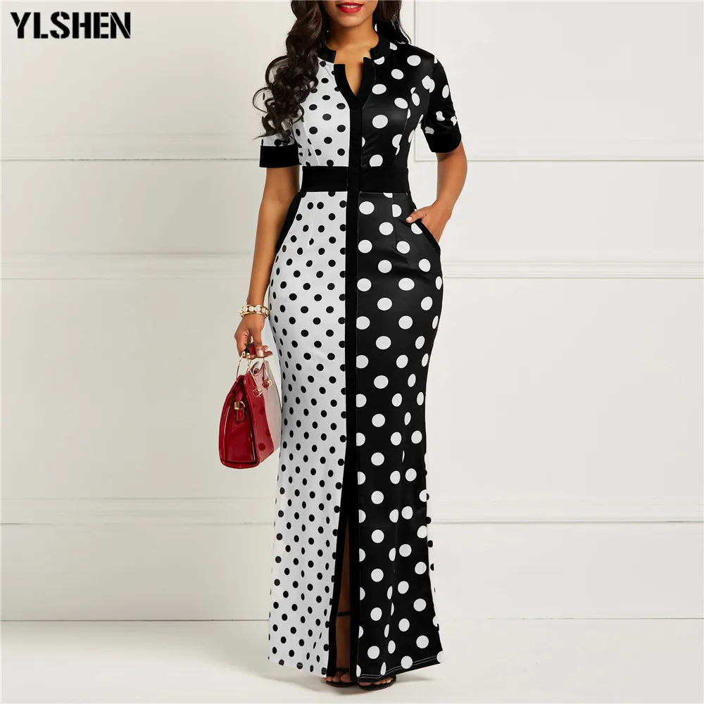 Африканское платье винтажное Макси платье в горошек белое черное с принтом Ретро облегающее женское летнее с коротким рукавом плюс размер ...