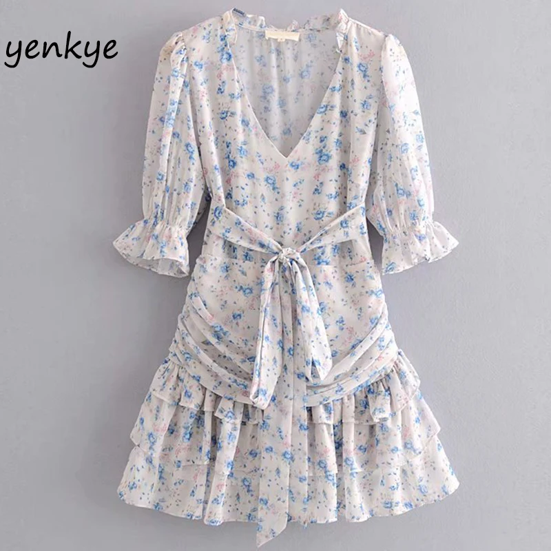 Милое нарядное платье с цветочным принтом, женское платье с v-образным вырезом и рукавом-бабочкой, многослойное ТРАПЕЦИЕВИДНОЕ мини-платье ...