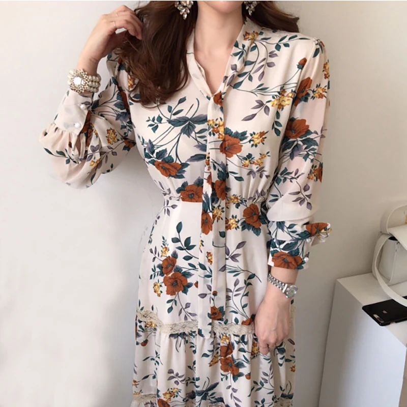 Летнее богемное винтажное женское платье с вырезом лодочкой kawaii boho flroal пляжное шифоновое платье с длинным рукавом повседневное корейское п...