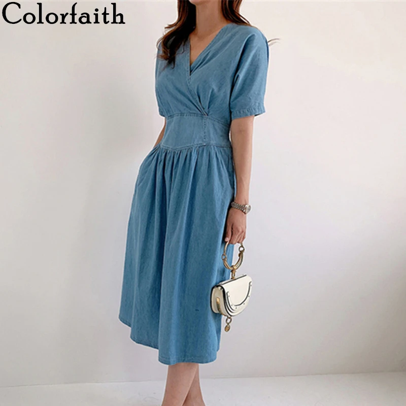 Colorfaith, новинка 2020, женское джинсовое платье, летнее, v-образный вырез, повседневное, корейский стиль, Ретро стиль, высокая резинка на талии, уличная одежда, длинное платье DR6720