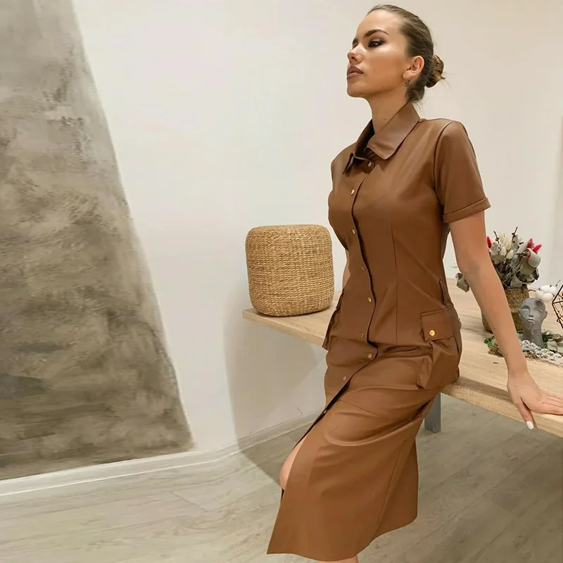 Женское Повседневное платье-футляр из искусственной кожи с карманами и коротким рукавом, летнее платье с отложным воротником, новинка 2020, модное платье-миди, Vestidos
