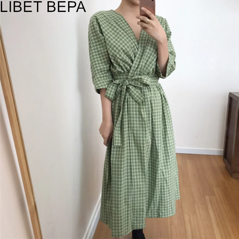 Женские платья в клетку с v-образным вырезом, плиссированные, с высокой талией, повседневные, на шнуровке, с бантом, с рукавом до локтя, длинное платье, весна-лето 2020, DR1822
