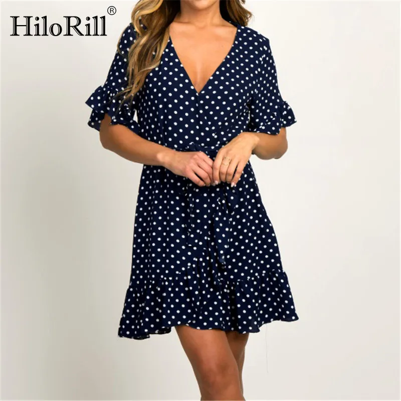 2019 летнее пляжное платье женское платье в горошек Мини шифоновое платье Сарафан богемский с оборками короткий рукав повседневное вечернее платье халат