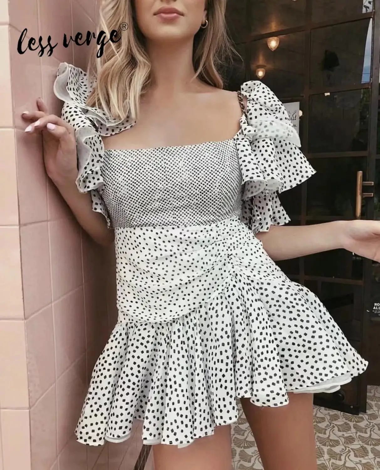 Lessverge точка белая сетка шифоновое платье сексуальные оборки, открытые плечи шнурок летнее платье женская элегантная пляжная одежда femme
