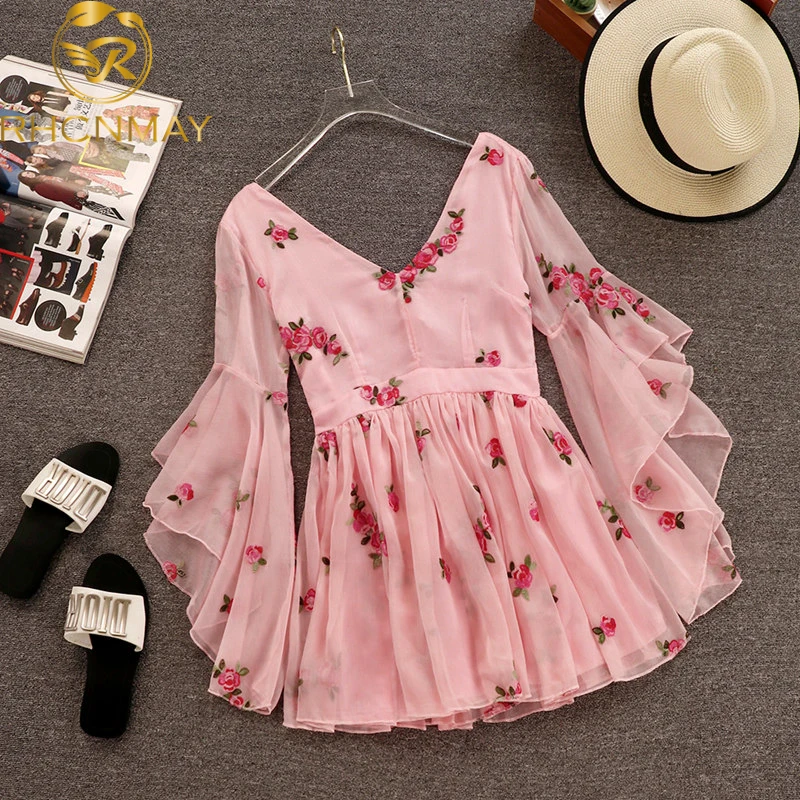2020 Новое модное летнее женское милое шифоновое платье с v-образным вырезом и цветочной вышивкой, облегающее короткое платье с расклешенными рукавами для девочек