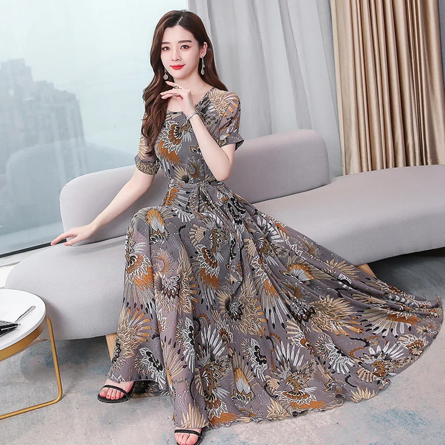 2019 Новое поступление Летние Элегантные Для женщин шифона с принтом богемное платье для пляжа, макси платье О-образным вырезом Повседневное ...