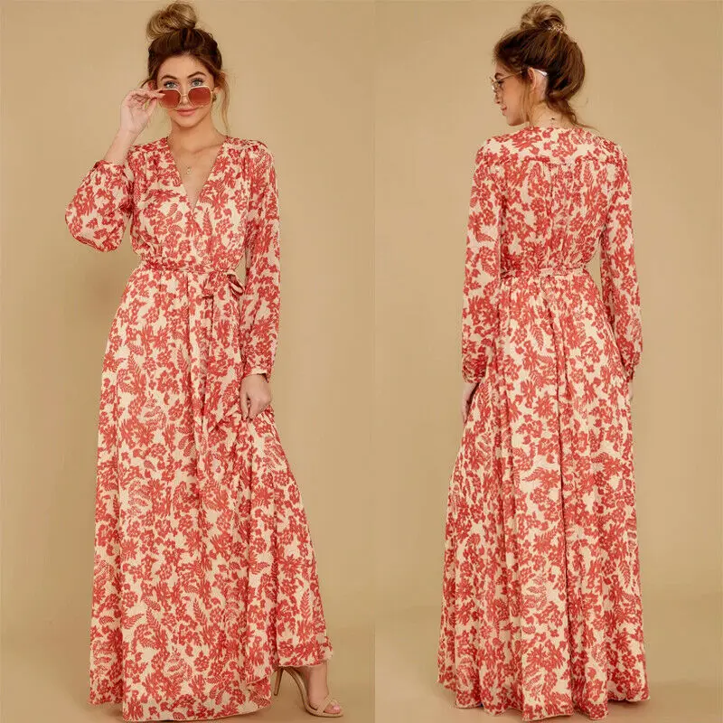 Богемное Женское Платье макси с v-образным вырезом и длинным рукавом, Бандажное платье с принтом, летние праздничные женские вечерние плать...